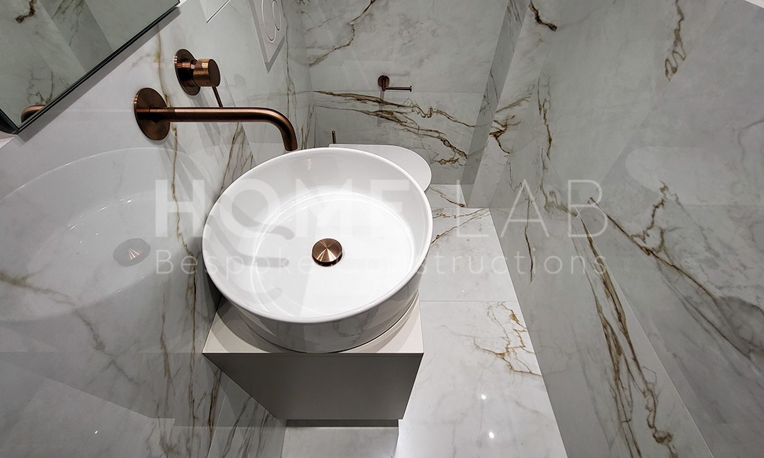 WC και χώρο ξεκούρασης με μπάνιο.Κυριαρχεί το ξύλο και τολευκό μάρμαρο με πινελιές οργανικών στοιχείων
